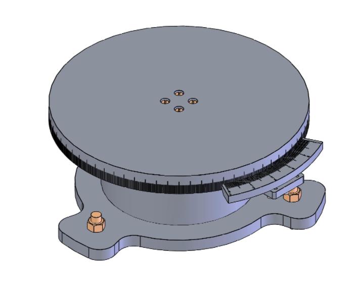 轉(zhuǎn)臺可調(diào)節(jié)水平的圓柱形底座,在所述的圓柱形底座上安裝有調(diào)平螺釘組件用于調(diào)節(jié)底座水平,航向轉(zhuǎn)動臺面上刻有刻度,通過操縱航向盤和鎖緊機構(gòu),與航向差分盤配合完成航向角的確定。也可以通過調(diào)整航向盤的位置,通過無磁編碼器的數(shù)字輸出數(shù)值記錄角度。